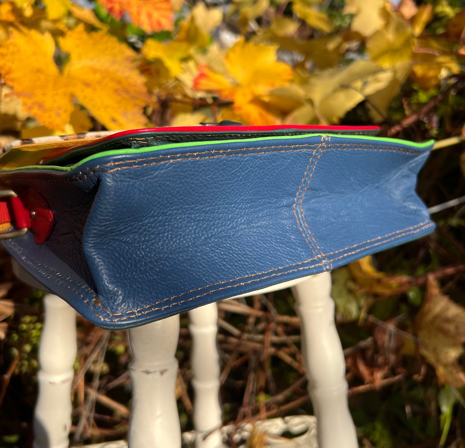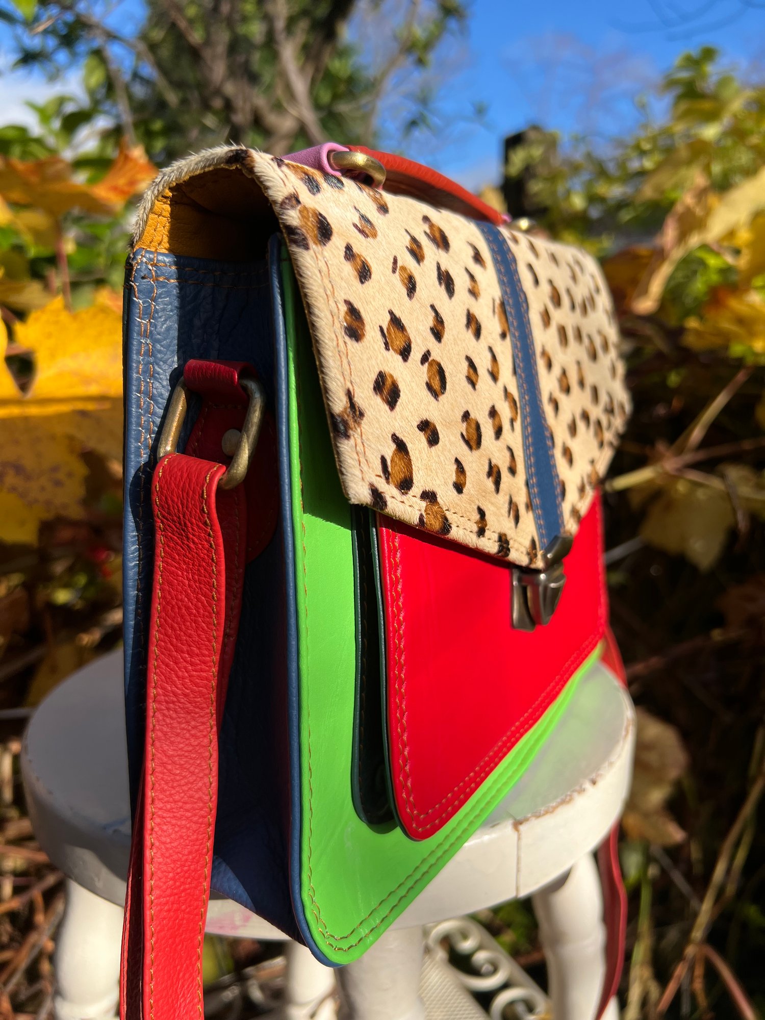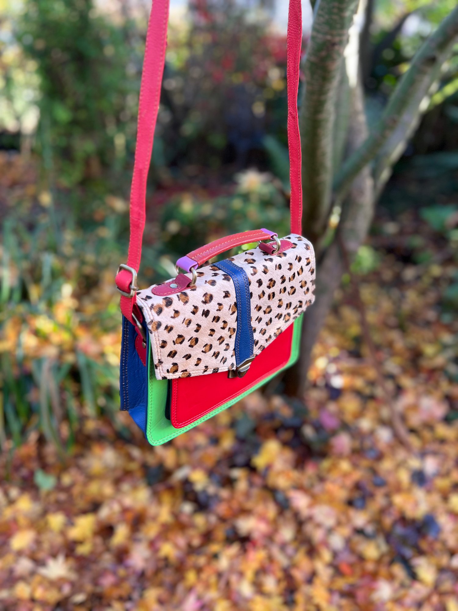 A favourite of our Harlequin Collection is this unusual recycled buffalo leather bag with shoulder strap and carry handle.